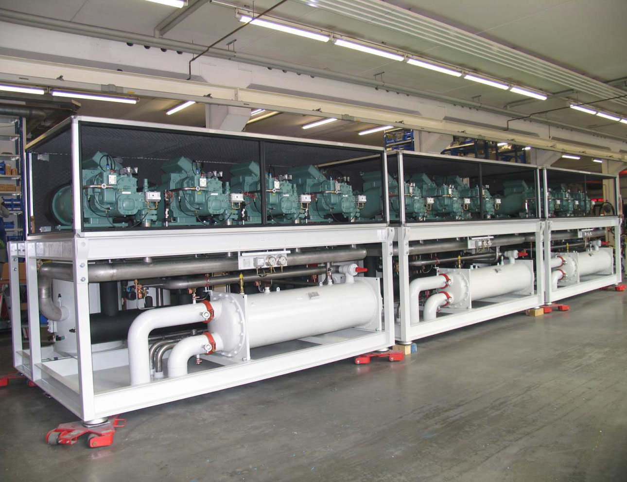 The machines are constructed with high quality European Refrigeration Components, put together on Rugged Heavy Duty Structural Skids, keeping the machines Vibration free. The various Refrigeration Components are connected together by High Quality, Seamless Stainless Steel tubes and pipes. Instruments and Safety Devices as prescribed by European Engineering Standards are provided to enable the machines to be granted the CE certification.